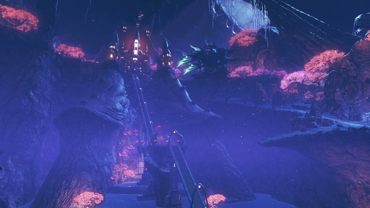 The Titans offer a wide variety of scenery. While map design and the level design for those maps is something that Monolith Soft excels at, we have changed some of the designs for this installment compared to our previous games. While players found enjoyment in climbing up mountains in Xenoblade Chronicles X, the gameplay for this installment can be summarized as climbing down them. There are sort-of pathways that lead downward at many locations. Even if it first appears that you can't climb down a certain location, there may be routes where you can walk across girders or fences, or hop across boulders to get to a new location.